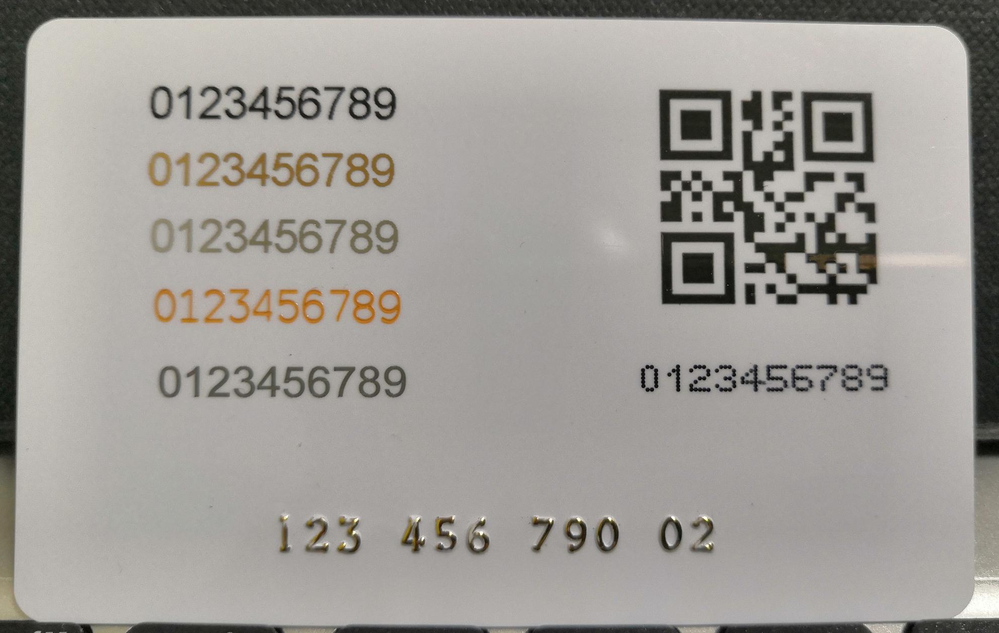 Thermo printing uses a carbon foil to print nice black text on the card. Gold and Silver hot stamps are stamp printed on top of the card. DoD printing, which is also called Drop on Demand or UV Cured Ink Jet Printing, is printed directly on the card surface. The QR code and number on the right hand size of the image is also a DoD printed image. Laser engraving is cut into the card plastic, making it the longest lasting and most durable. The others are good for years, but laser engraving is good for the life of the card. You might recognize the embossed number at the bottom middle as exactly what old school credit cards use. This printing also is good for the life of the card.