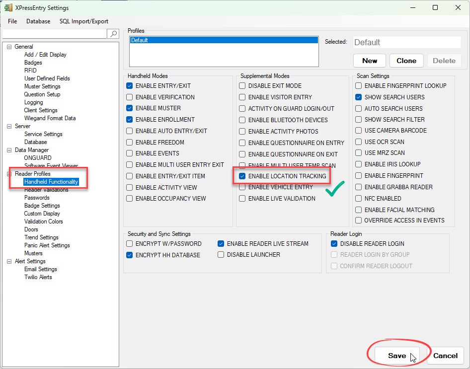 Reader Profiles → Handheld Functionality - Check the box: Enable Location Tracking