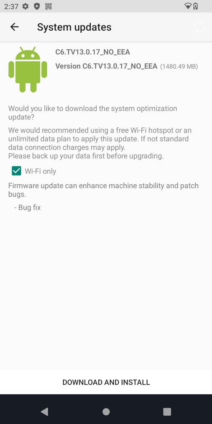 4. Click Download And Install to beginning the update process. Uncheck Wi-Fi only if downloading over a cellular connection. Due to the size of the download, Telaeris recommends updating over Wi-Fi or Ethernet only. The download and install will take approximately 30-40 min depending on network speed.