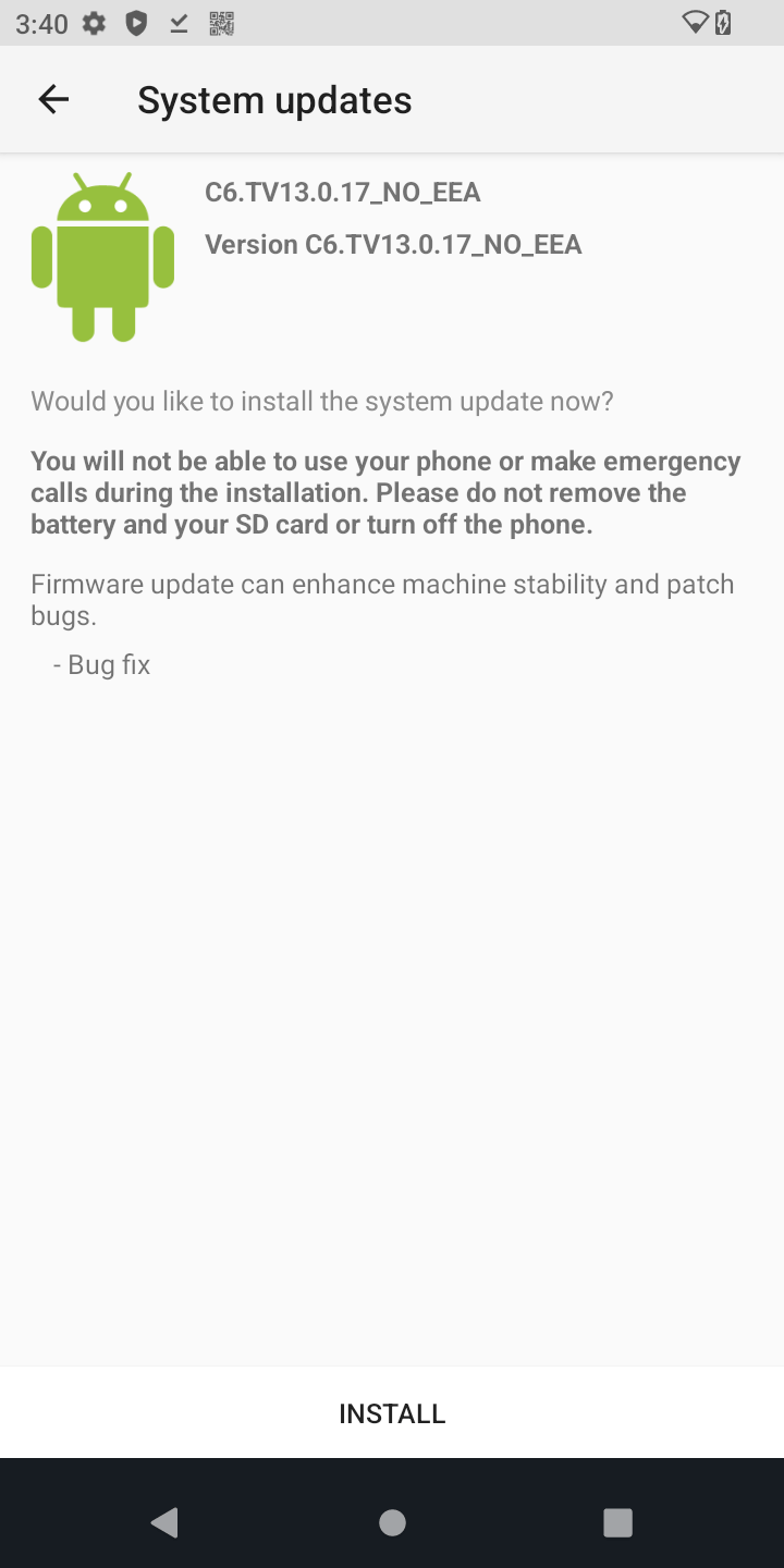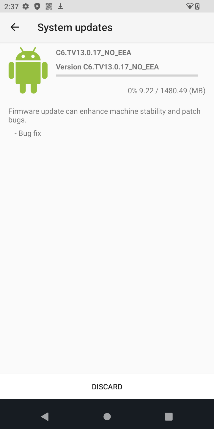 In order to perform OTA updates, then minimum Android version installed must be Build Number 16. Full Build Number C6.TV13.0.16_NO_EEA.