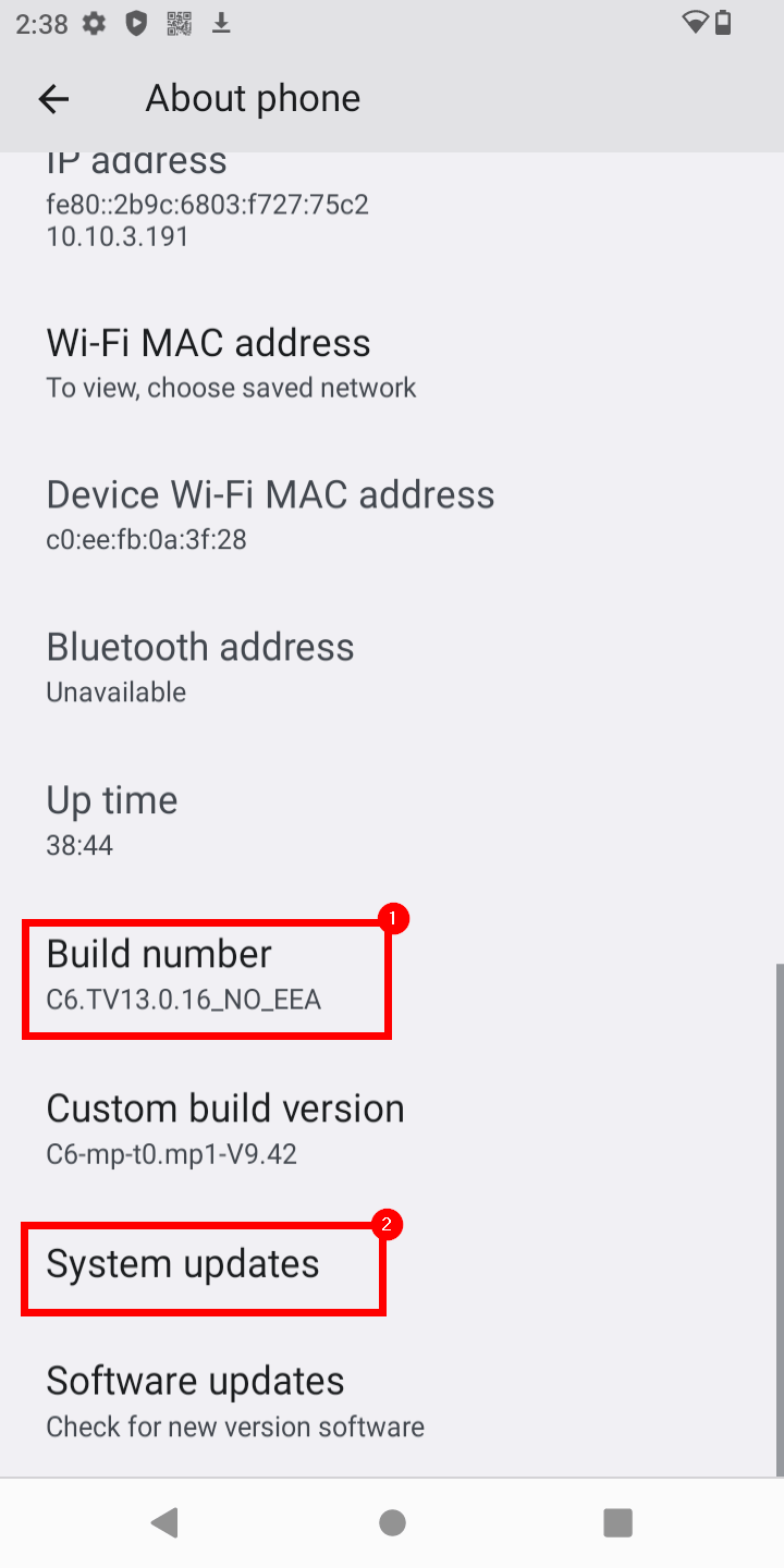 3. Here you can see the Build Number (1) and click System updates (2).