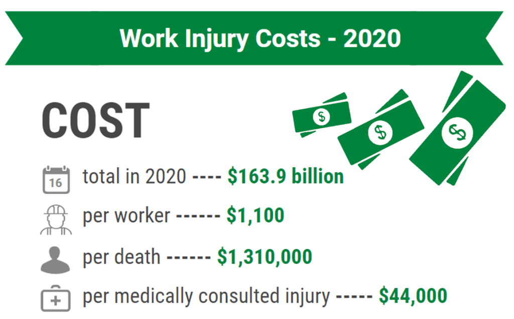 According to the National Safety Council (NSC) in 2020, the total workplace injury costs were about $163.9 billion resulting in 4,113 deaths. This breaks down to $1,100 per worker, $1,310,000 per death, and $44,000 per medically consulted injury. The NSC has also estimated that there were close to 100 million days lost due to injuries in 2020 for all the workers that were injured.