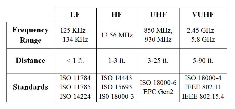The frequency that any specific RFID tag might operate on is due to a combination of factors, including, but not limited to, the functional requirements, the environment the tag needs to work in, mounting considerations, physical limitations due to the frequency, and oddly enough, historical considerations. The table below is not exhaustive but provides a good overview of the major frequencies and RFID standards in use today.