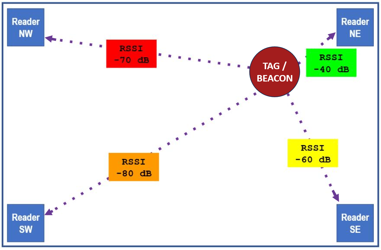 The below graphic displays four readers receiving an active (battery-powered) tags’ beacon signal. If fewer than three signals from a beacon are received, its location can be isolated to a room-sized area based on its RSSI (Received Signal Strength Indicator). With three or more signals, a beacon can be located more precisely, generally within 3 meters. In theory, with triangulation you only need three reader-beacon distances to precisely locate a tag. However, the signal strength, measured in decibels (dB), is only loosely related to distance, which is why the location is not more precise.