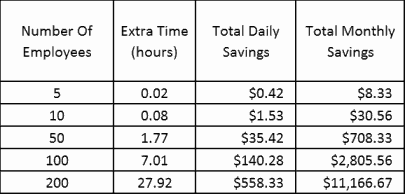 I personally find it more intuitive to look at actual examples of the how much money can be saved by reducing wait times. Below is a table for the savings of reducing two seconds from each person’s wait time in a line, for a variety number of employees that might wait in a line. It is surprising to note how fast the savings increase with the number of employees.